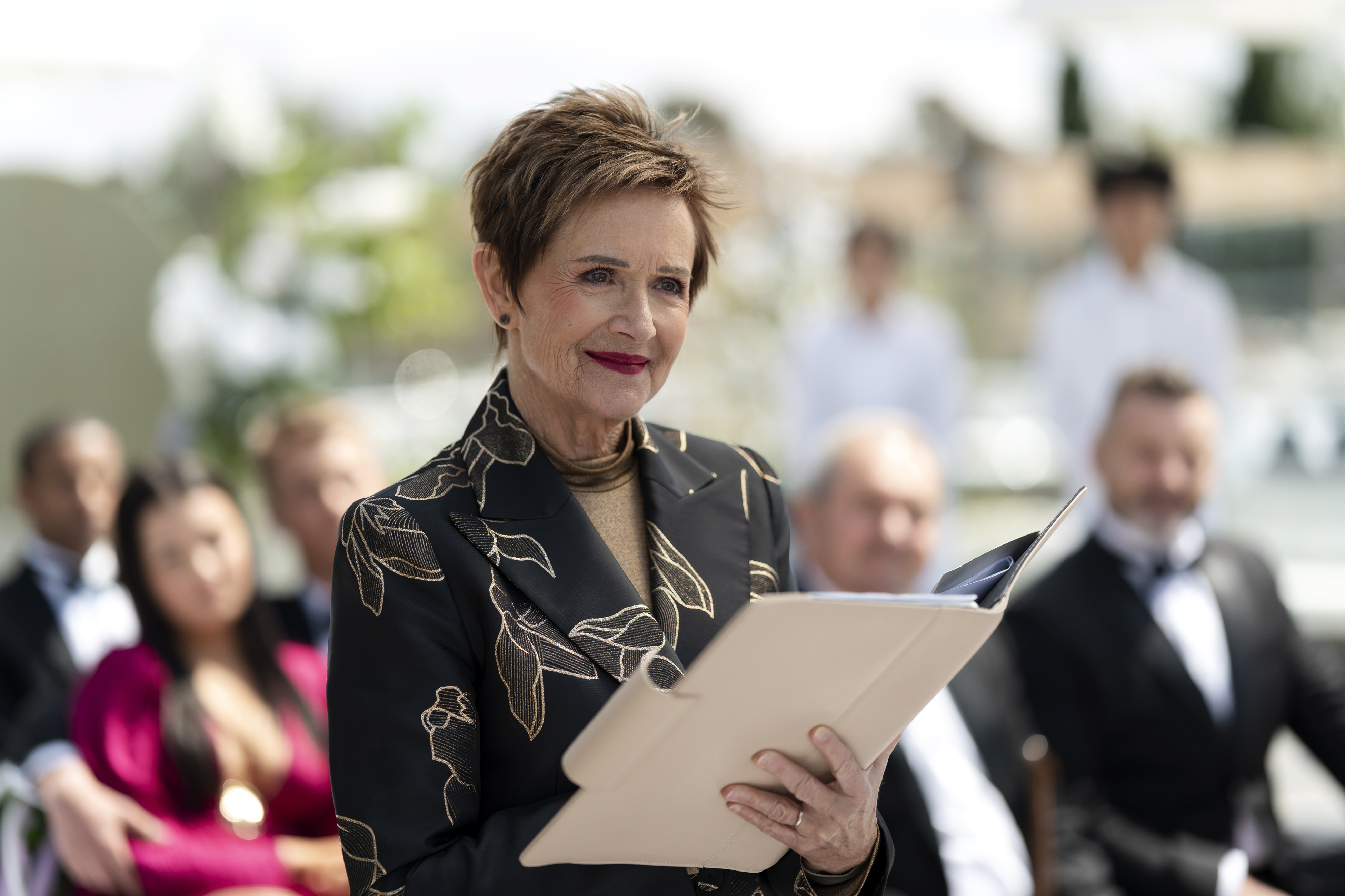 Among the people viewing the exhibition is a familiar face as Anne Charleston, who played the late Madge Bishop, appears as a woman called Agnes Adair, who’s a dead ringer for the former Ramsay Street resident. Tell us about that…