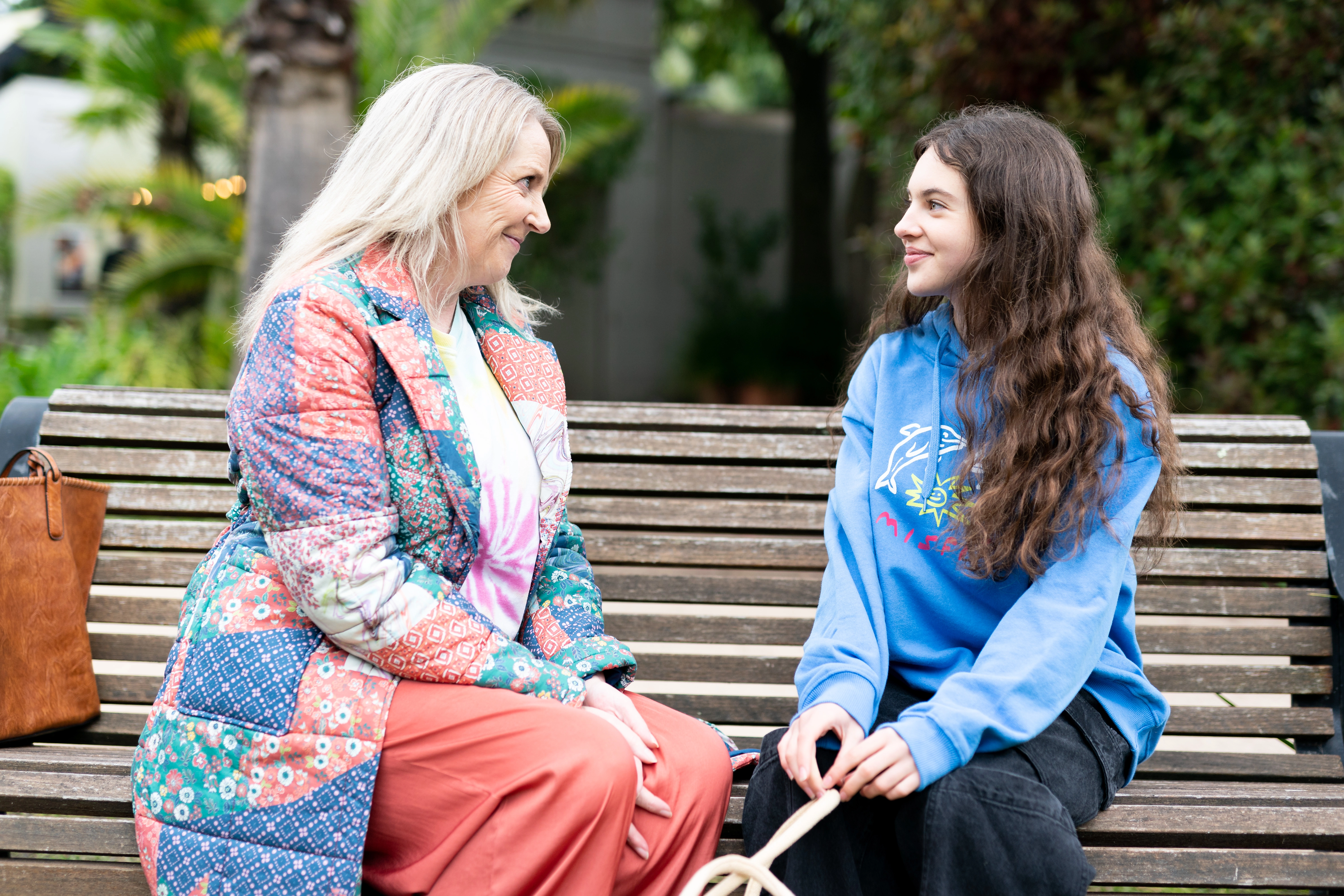 Nicolette Stone (Hannah Monson) sees how down-in-the-dumps her mum, Jane Harris (Annie Jones), is about the upcoming closure of Erinsborough High School.